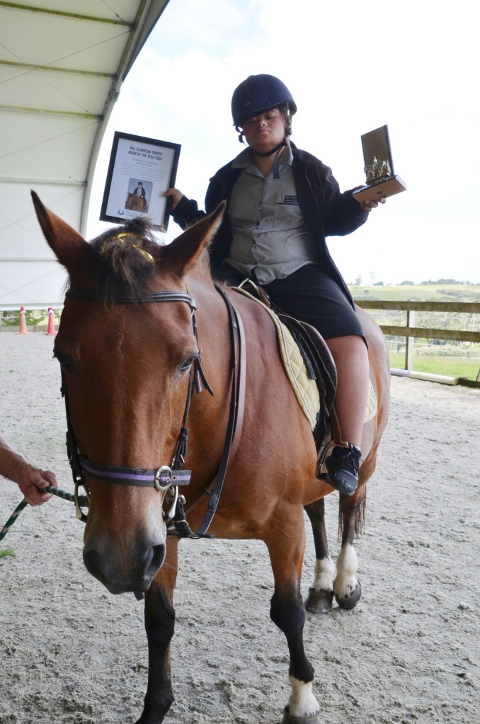 The rider of the year has been awarded to Grace Tuhi for doing really well and trying her best in all tasks. Her posture has improved as well as control of her reins. Her strength has increased with standing in her stirrups. Grace has become more independent by making her own choices on riding outcomes during a session.