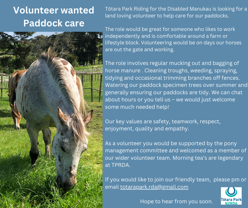 No previous experience with horses or people with disabilities is necessary as training is given. All volunteers follow NZRDA standardised training programmes to achieve the required proficiency. Tōtara Park Riding for the Disabled Association has two active coaches. Both completed their NZQA qualifications to become Level 3 RDA coaches, supported by NZRDA.